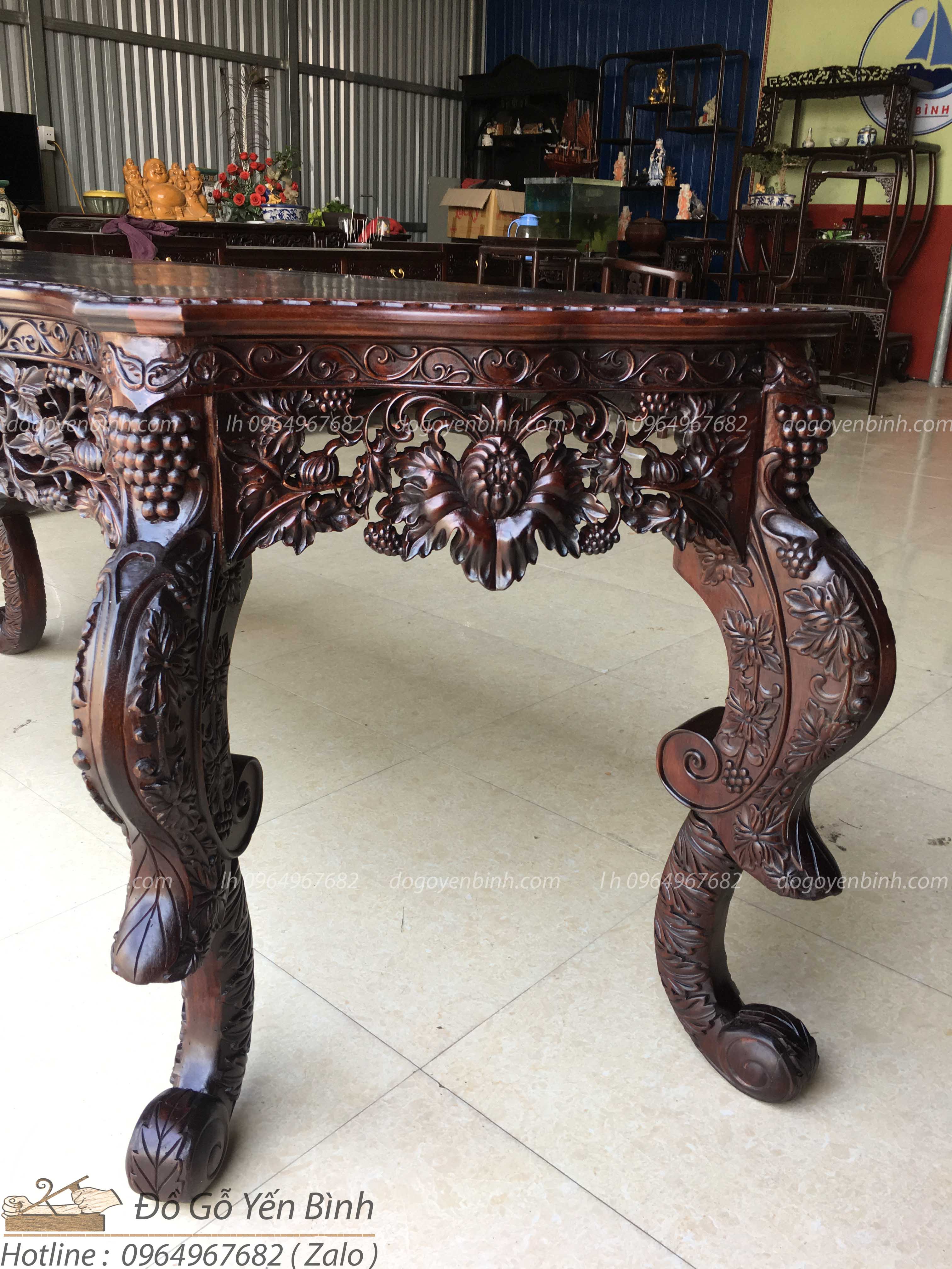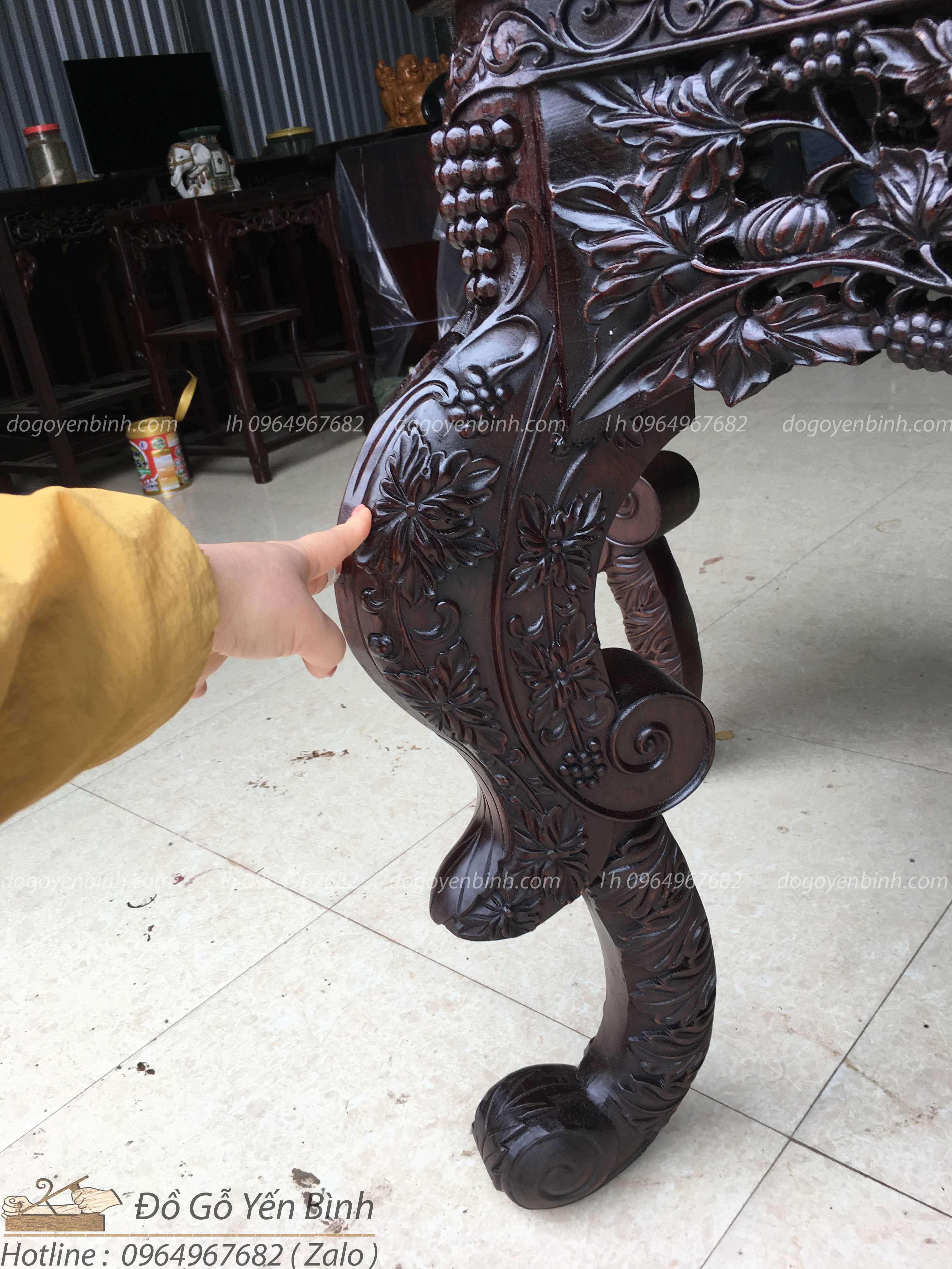 Cây nho mang đến cát khí mạnh mẽ cho gia chủ. Được khắc chạm trên chiếc bàn vừa là một chiếc bàn bày đồ tiện dụng. Nho là giống cây thân leo nhưng gốc lại có thể tự phát triển để tự mình đứng vững. Thể hiện sự kiên trì và sức sống mãnh liệt. Qủa nho hay kết lại thành chùm quả to, quả nhỏ mang ý nghĩa của sự sum vầy, sung túc và ấm lo quanh năm.