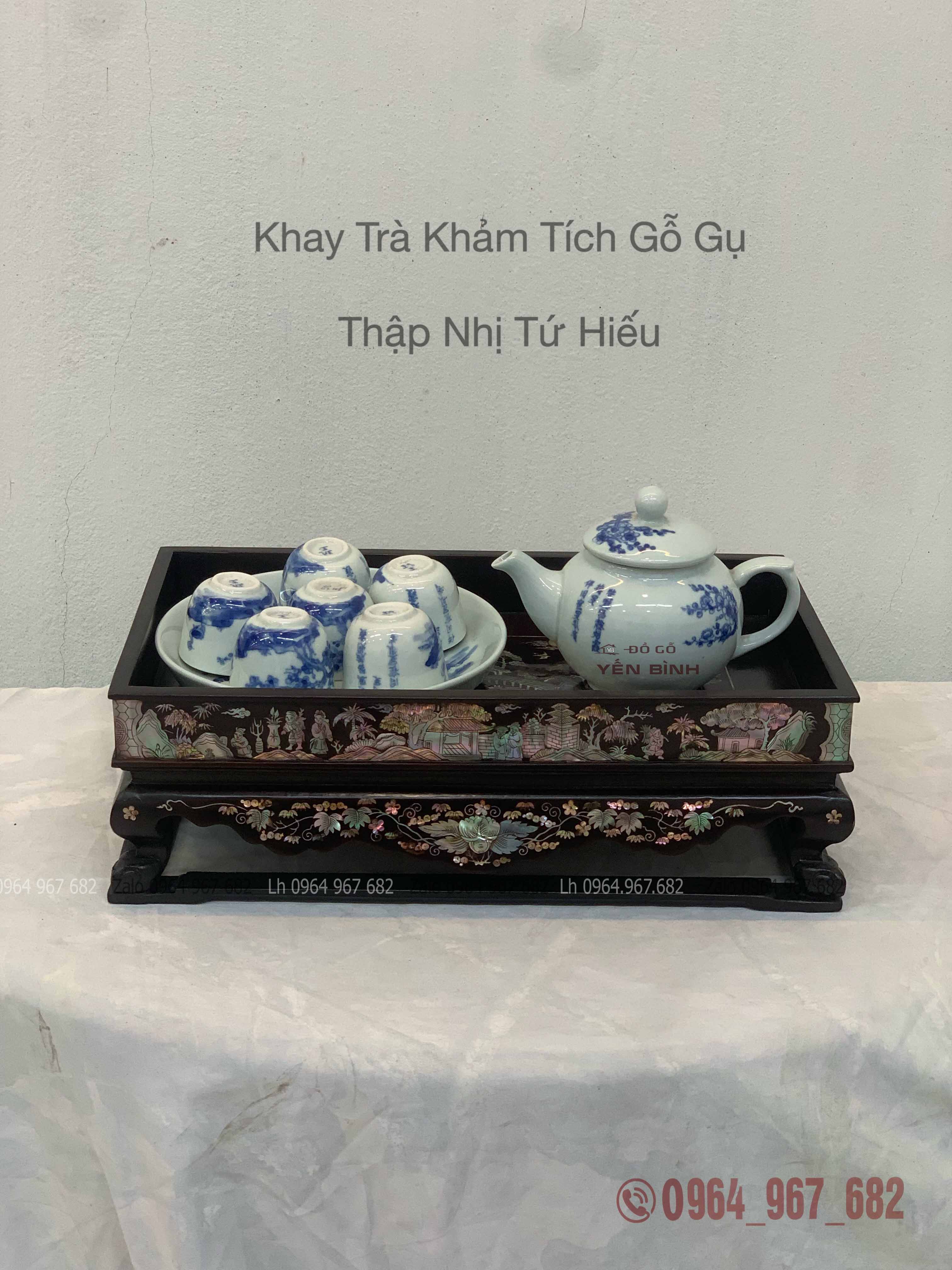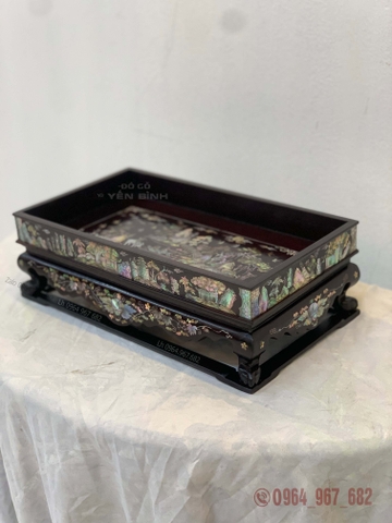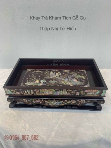 Khay trà được khảm tứ diện tích thập nhị tứ hiếu ,các đường nét tơ tóc được tỉa tách vô cùng kĩ thuật và sắc nét. Bệ quây được khảm dây dưa lá nho rất đẹp mắt.