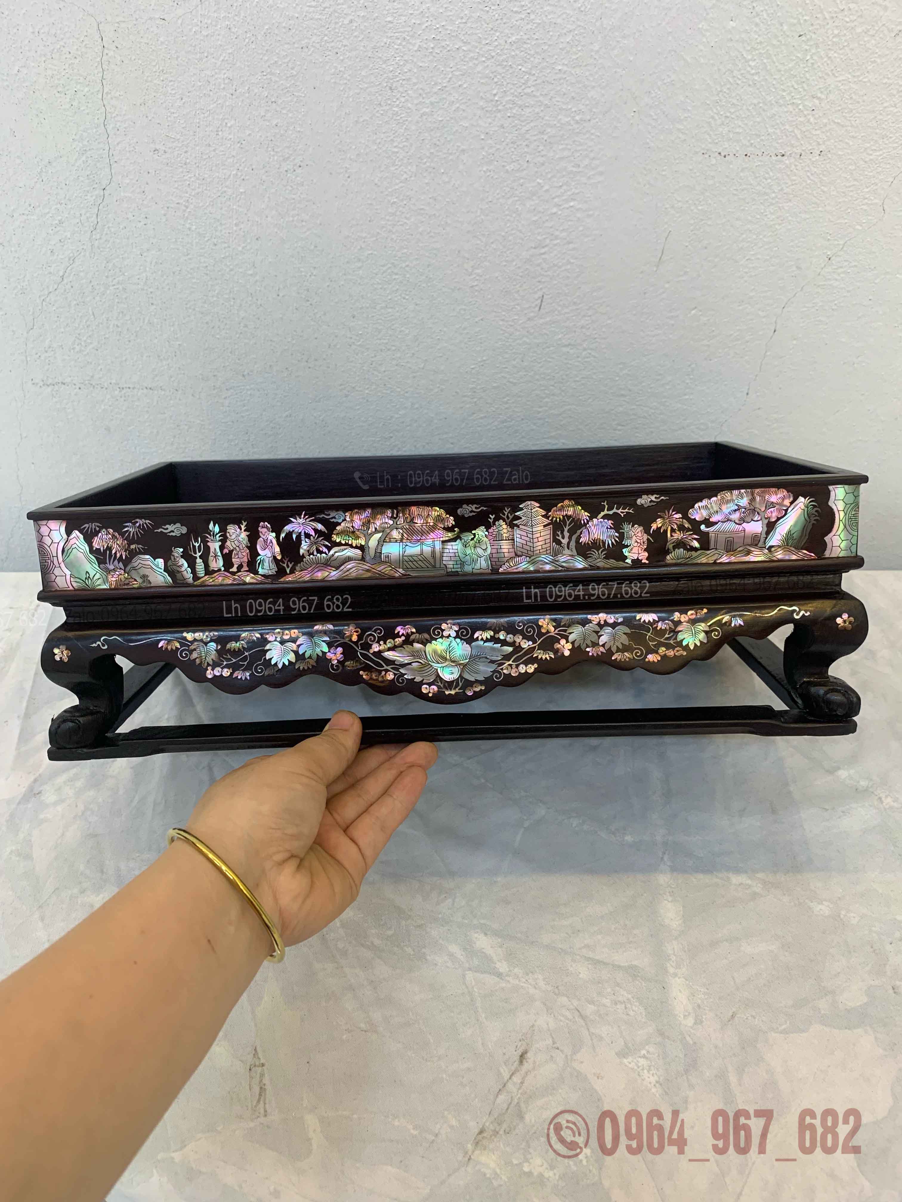 Khay trà khảm tích , được làm từ chất liệu gỗ gụ có thông số kích thước là dài 35 cm rộng 20 cm cao 11 cm.