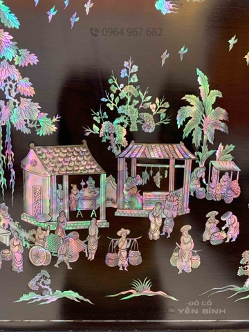 Tranh gỗ gụ cẩn (khảm) ốc tích "Chợ Quê" là dòng tranh phong thủy cao cấp, tái hiện khung cảnh sinh hoạt nhộn nhịp, mộc mạc của làng quê Việt Nam xưa với các hình ảnh đặc trưng như cây đa, giếng nước, đình làng và cảnh buôn bán tảo tần, thể hiện cảnh sinh hoạt bình dị, mộc mạc của người dân.